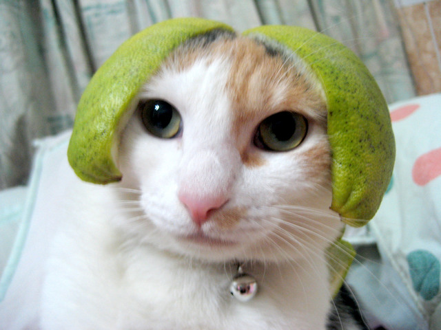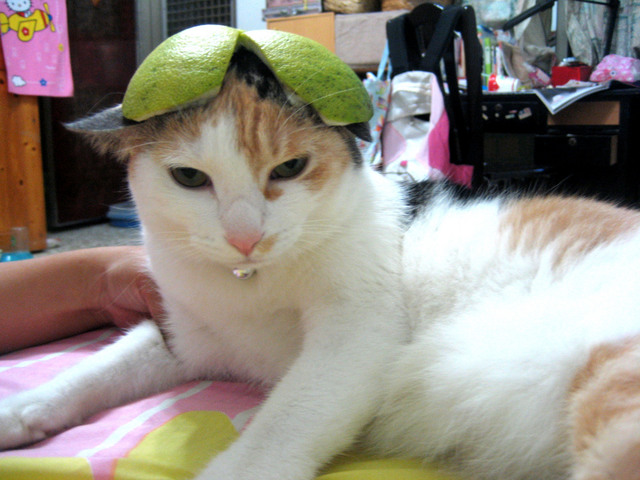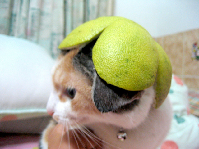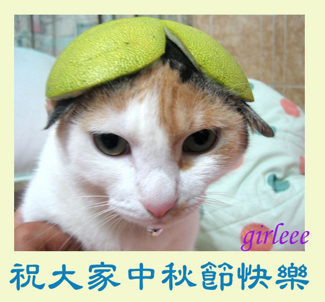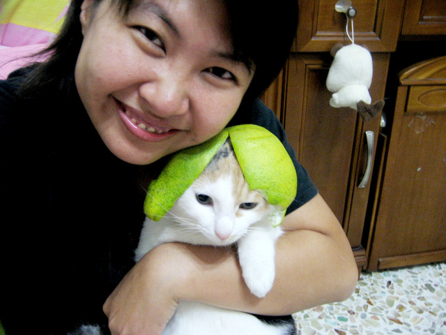 為了拍一張完美的柚子貓.可是花了我不少時間耶 剛開始帽子太大了..我還拿剪刀重新修剪 整個臉看起來好呆喔.. 要用手抓著以免她逃跑. 哈哈~~~~~~~~