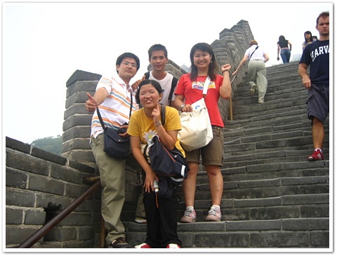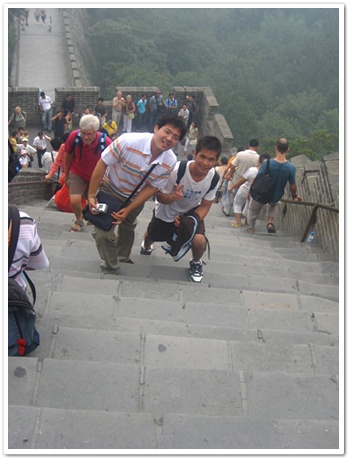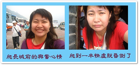 但是爬了一段時間後,我開始不行了..因為爬長城可不是我原先想的那麼輕鬆..長城很陡的.而且每個階梯很大.每跨一步都很吃力,更重要的是不能停下來休息,因為人超多的,一停下來就會擋到後面人的路,所以只能一邊流汗喘氣一邊奮力的往上爬。