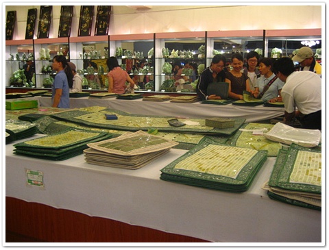 上面這個是玉枕,聽說乾隆皇帝能活那麼多歲,是因為御醫告訴他睡覺時要保持頭冷身熱,所以乾隆都睡玉枕。這個玉枕冰冰的,真的滿舒服的,等級也從200~600元。小陳一直推銷我們四個人買玉枕,一直叫我們買回去送給爸媽,我們很尷尬.因為不太想買.但是小陳一直勸說..我們趕緊閃避,後來發現小陳也一直叫其他團友買。