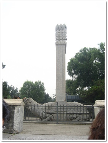 明十三陵位於萬壽山上,聽說明朝的13各皇帝的陵墓都在此,我們今天要去參觀的是已經開挖完成的定陵。定陵是明朝萬曆皇帝的陵墓,聽說萬曆皇帝在陵墓建成後,開始昏庸.奢侈起來,所以明朝至此後開始衰退。我們走了9層樓梯到地宮去參觀以前放棺材的地方,聽說原來的棺木和屍體,在文革時被放火燒了,現在地宮裡的棺木是後來造的..但是因為總是以前放靈柩的地方,導遊要我們不要拍照..因為不吉利。
