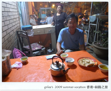他做完生意.來這裡叫了幾根羊肉串和一個大囊..把囊放進熱茶沾著吃.
