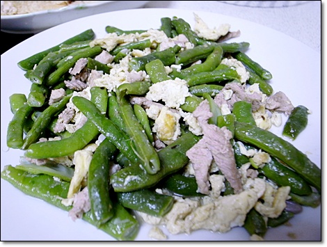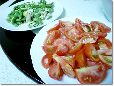 番茄拌砂糖+豆子炒蛋+炒辣子.