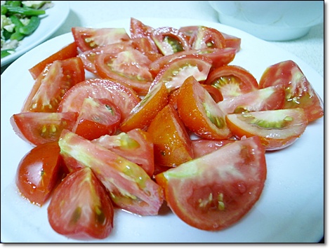 當時覺得這種吃法很妙..可是吃起來番茄不酸了.甜甜的.兩者意外的搭耶.