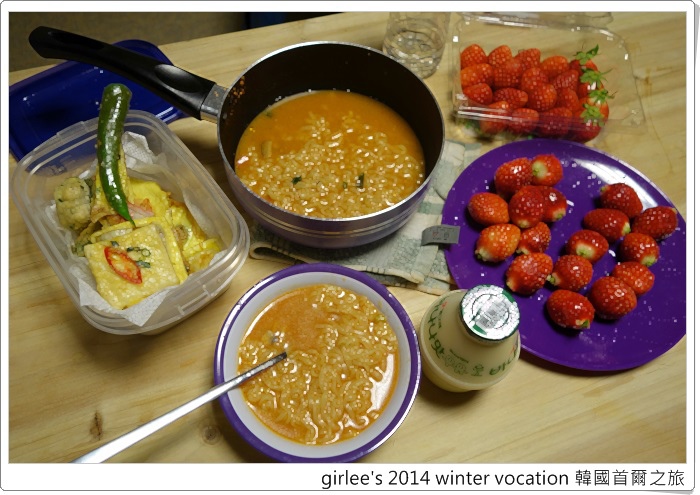 最後一晚買了辛拉麵泡麵回旅館廚房自己煮來吃..配上、香蕉牛奶、新鮮的草莓和小吃攤吃不完外帶的炸物..超豐盛的感覺吧~~