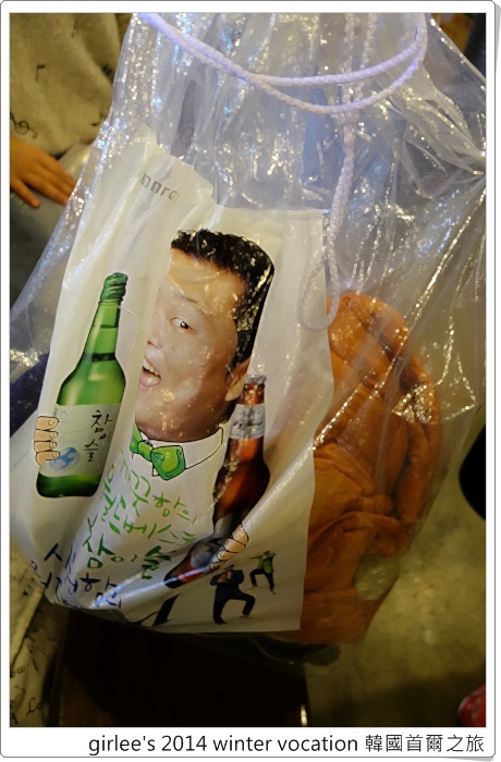 我們想點小酒來配烤肉吃..但是不會用韓語表示.看到包外套的大袋子上印有姜虎東先生拿著酒的圖片.就跟服務生指著它說我們要這個..