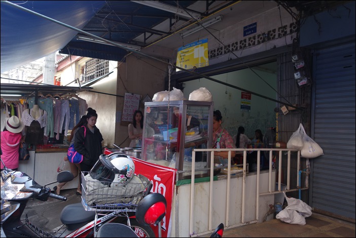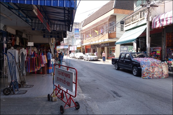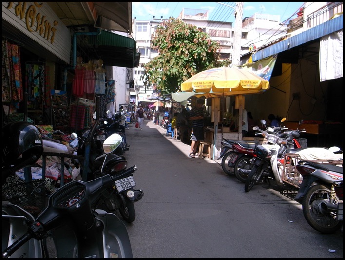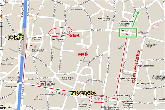 清邁古城出塔佩門後.先走羅伊克羅路(Loikroh Rd.).這條是向右邊的的單行道.接著還沒到長康路(Chang Klan Rd.)前有條往上走的單行道(Thapae Rd Lane 1).這條路很小條屬於小巷子了...一直騎到跟塔佩路(Tha Pae Rd.)的交叉口後.就會看到下下一張街景地圖中的畫面.過這馬路到對面的小巷子(Kuang Men Rd).接著停好車就可以開始逛了.