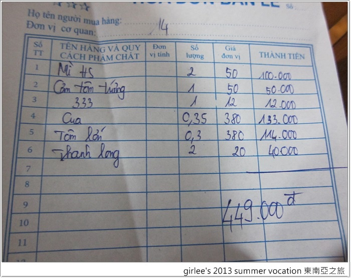吃海鮮當然要點喝的囉..我點了333啤酒(1萬2越盾).另外兩人點火龍果汁(2萬越盾)