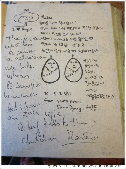 而且我們因為有認識的人-兩個從台灣來達蘭薩拉學佛的女生(小寶和大寶).她們兩個熱心地帶我們去吃了美味的韓國料理和超好吃披薩..還帶我們去逛了特色商店.買了很花俏但好看的花衣服和價格合理的喀什米爾圍巾.還有與我們聊天說了很多關於達蘭薩拉的藏人故事..更讓我們深深地喜歡上這裡.