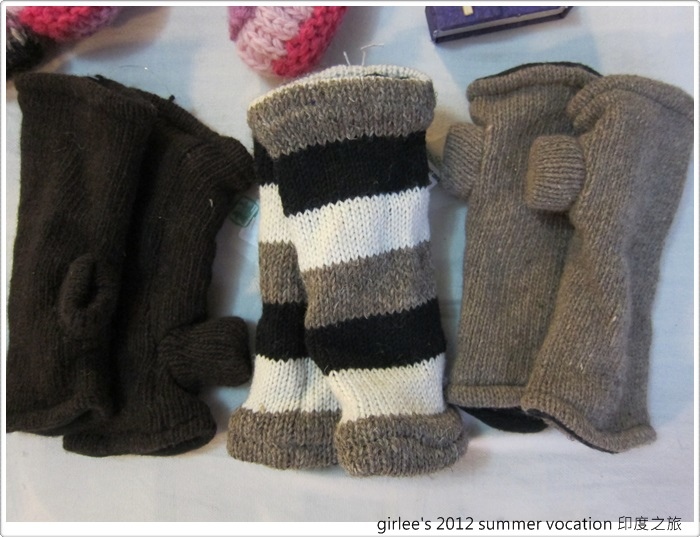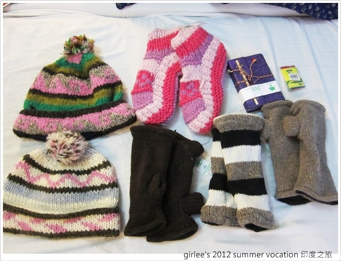 毛帽兩頂(80rs*2)、手套(180rs*2) 、毛襪(165rs*2)、小五色旗(30rs)、筆記本(70rs)