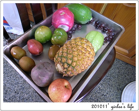 水果:鳳梨一個、奇異果3個、蕃茄2個、青木瓜一個、甜菜根一個、西洋梨一個、葡萄20個、芭樂一個、蘋果一個、火龍果一個